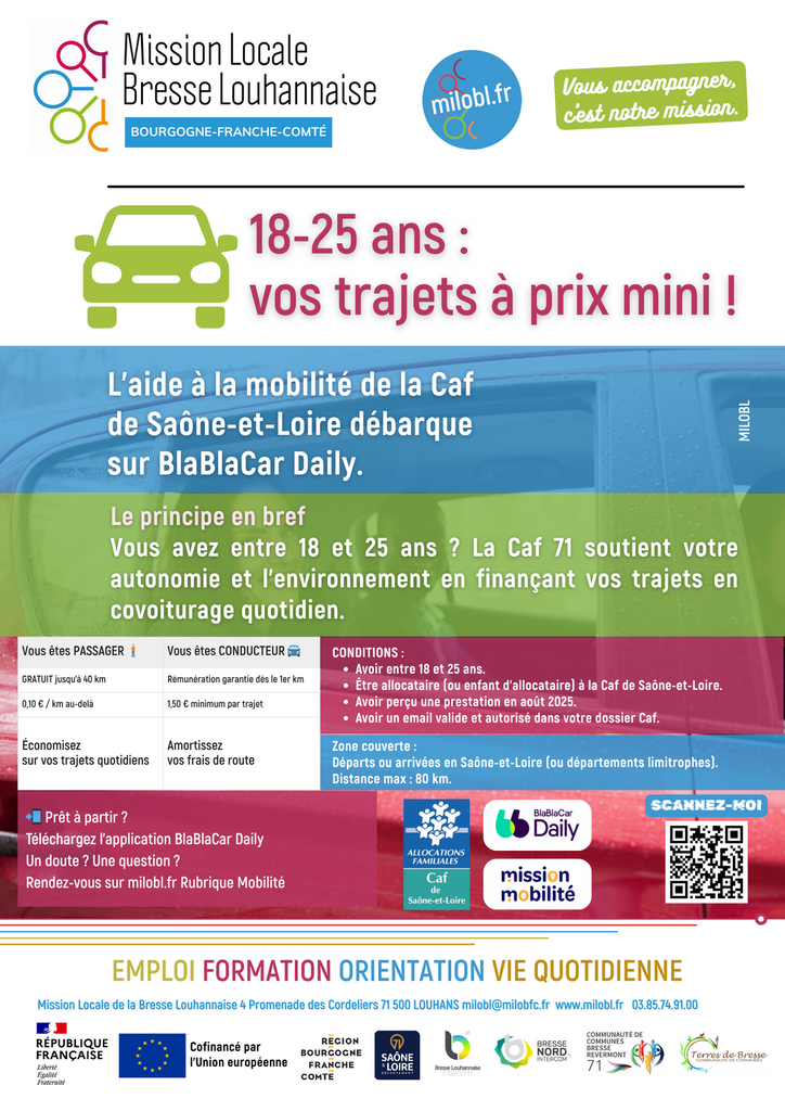 Pour toute question complémentaire ou pour être accompagné dans vos démarches de mobilité, l'équipe de la Mission Locale de la Bresse Louhannaise se tient à votre disposition :